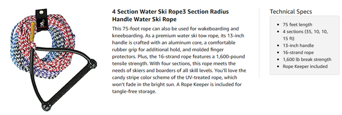 Performance Water Ski Rope This 75 foot long rope has 4 sections (75',60',50',40') to meet the needs of skiers and riders of all skill levels. The 12" aluminum core handle has a performance Tractor grip and full-length molded finger protectors. You'll love the candy stripe color scheme of the UV-treated 16-strand 1,600 lb. tensile strength rope. A Rope Keeper is included for tangle-free storage.