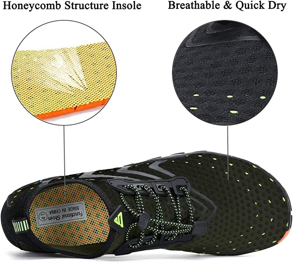 • FOOT SAFETY: The beach shoes is made of breathable lycra materials and flexible rubber sole, possess the effect of barefoot acupressure. Durable rubber soles with comfortable thicken honeycomb structure insole, protect your feet from getting hurt by rock and stone