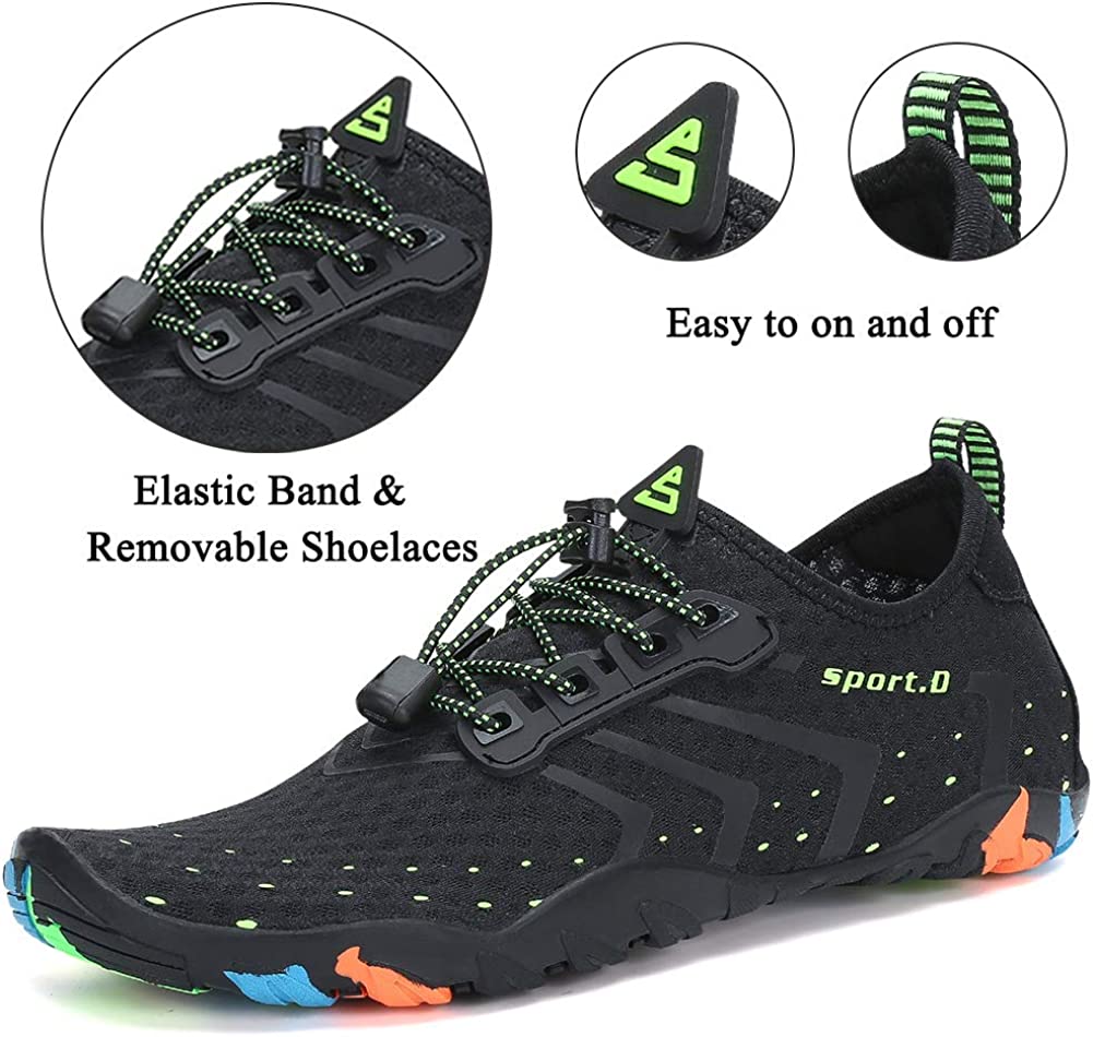 • ELASTIC BAND: Elastic band with removable shoeslaces help adjust the shoes according to the width of the feet quickly, convenient and did not step on the troubles of shoelaces. The swim shoes use of lycra material, increase comfort, it more closely fit the feet so that not easy to fall off