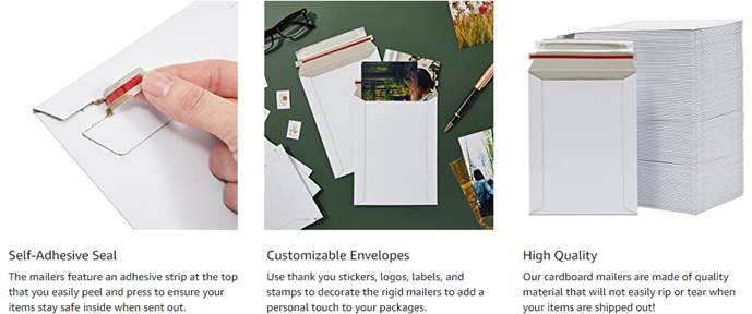 • Photo Mailers: These photo envelopes have an adhesive strip at the top to ensure contents remain inside while in transit; simply peel, seal, then press to adhere the two ends together