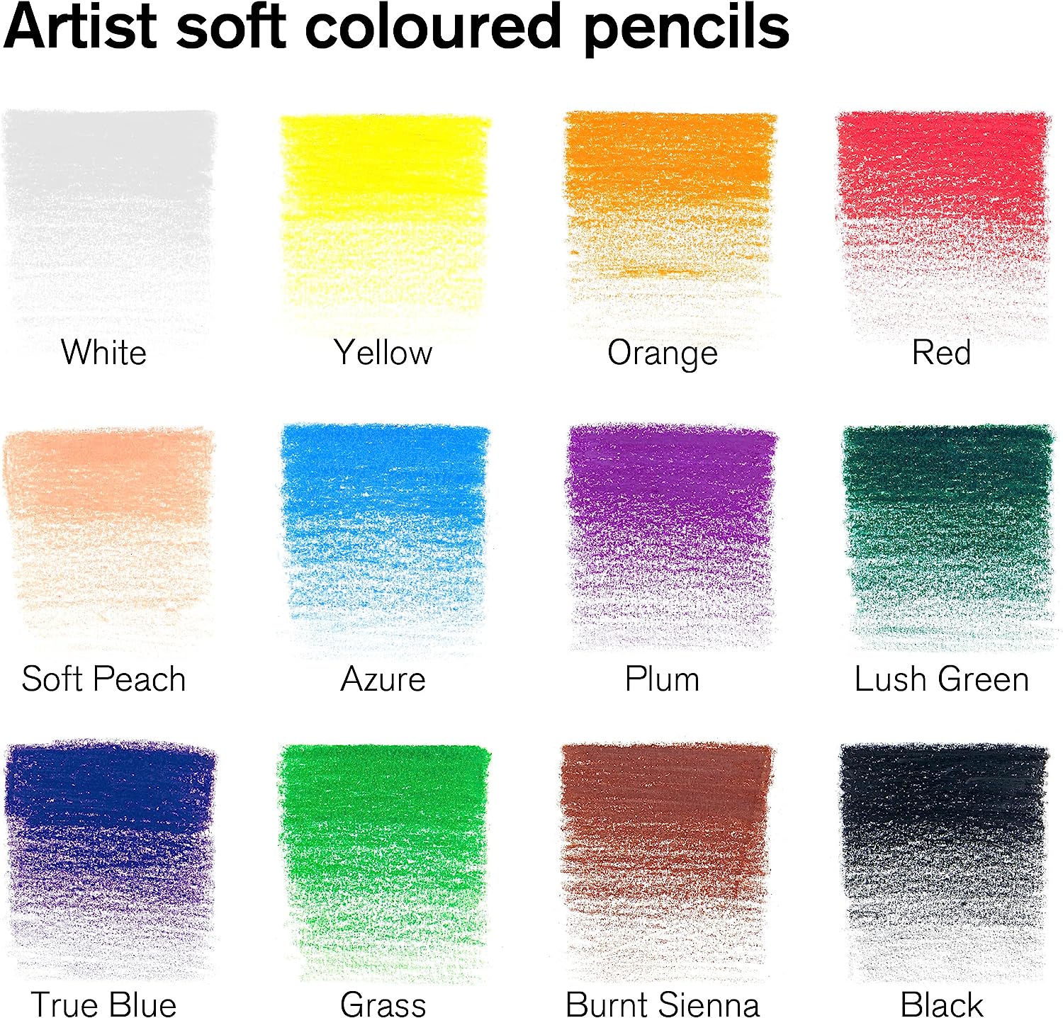 Create artworks that sing with wonderfully rich, vibrant colour with these thick-core pencils. Their soft texture makes blending easy and the high-quality cores mean they're beautifully smooth and responsive to use, whether you're building up intense colour or working on delicate shading. Each pencil sharpens cleanly to a neat, precise point that will not break, even under pressure. Set includes 1 each; White, Yellow, Orange, Soft Peach, Red, Plum, Azure, Lush Green, True Blue, Grass, Burnt Sienna, Black