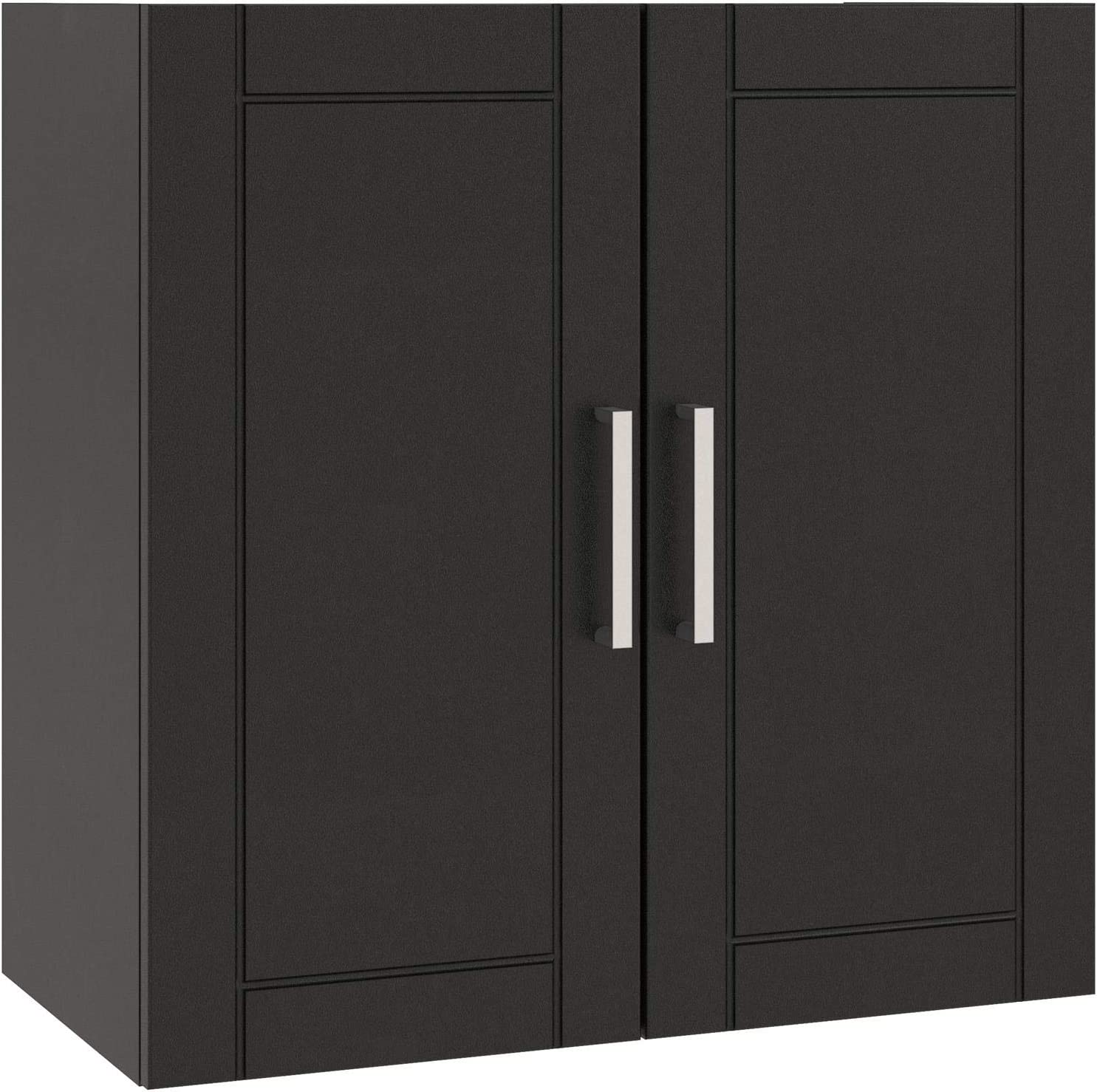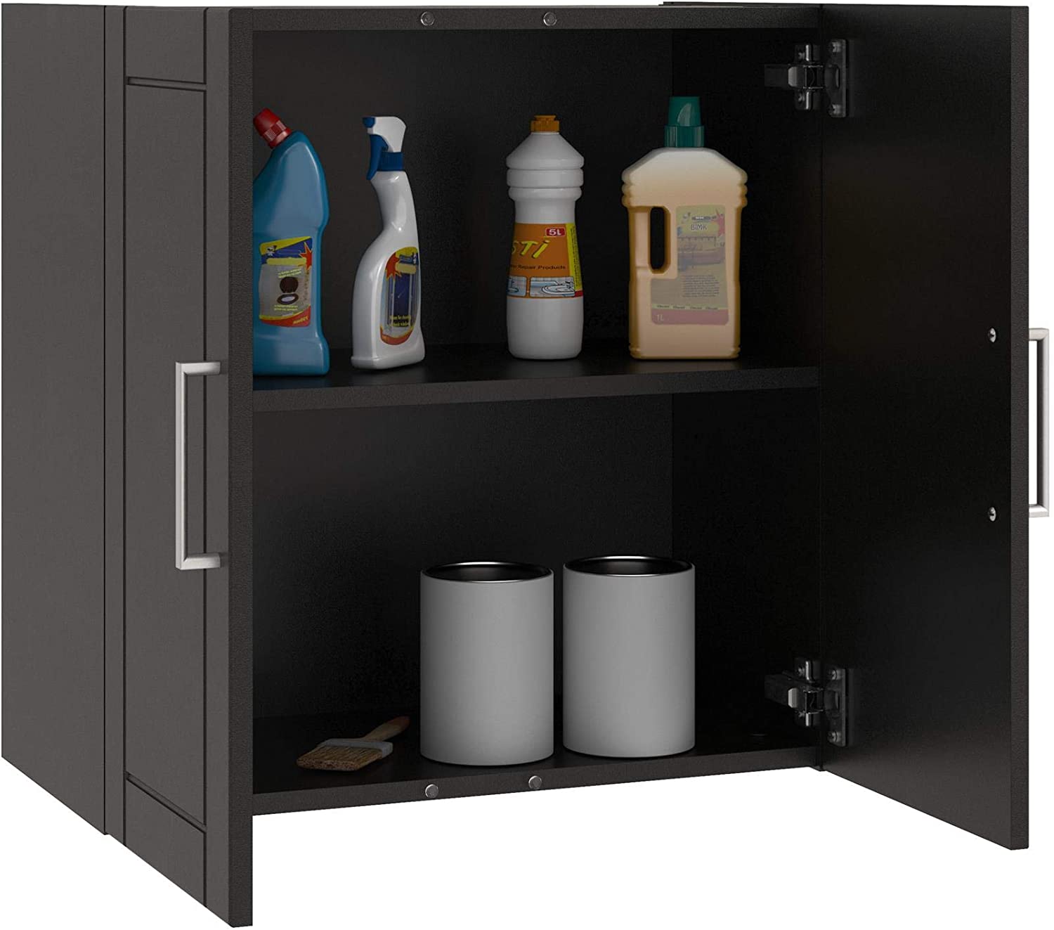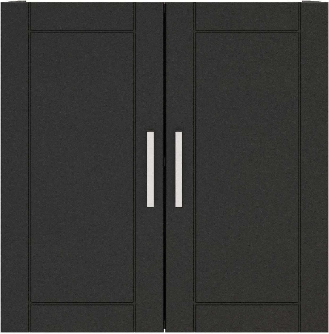 • Made of laminated MDF and particleboard, the water resistant black finish on the shaker style doors can be easily wiped clean with a damp cloth Two shelves, 1 adjustable, behind the 2 doors provides