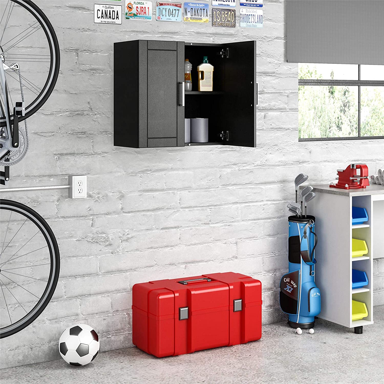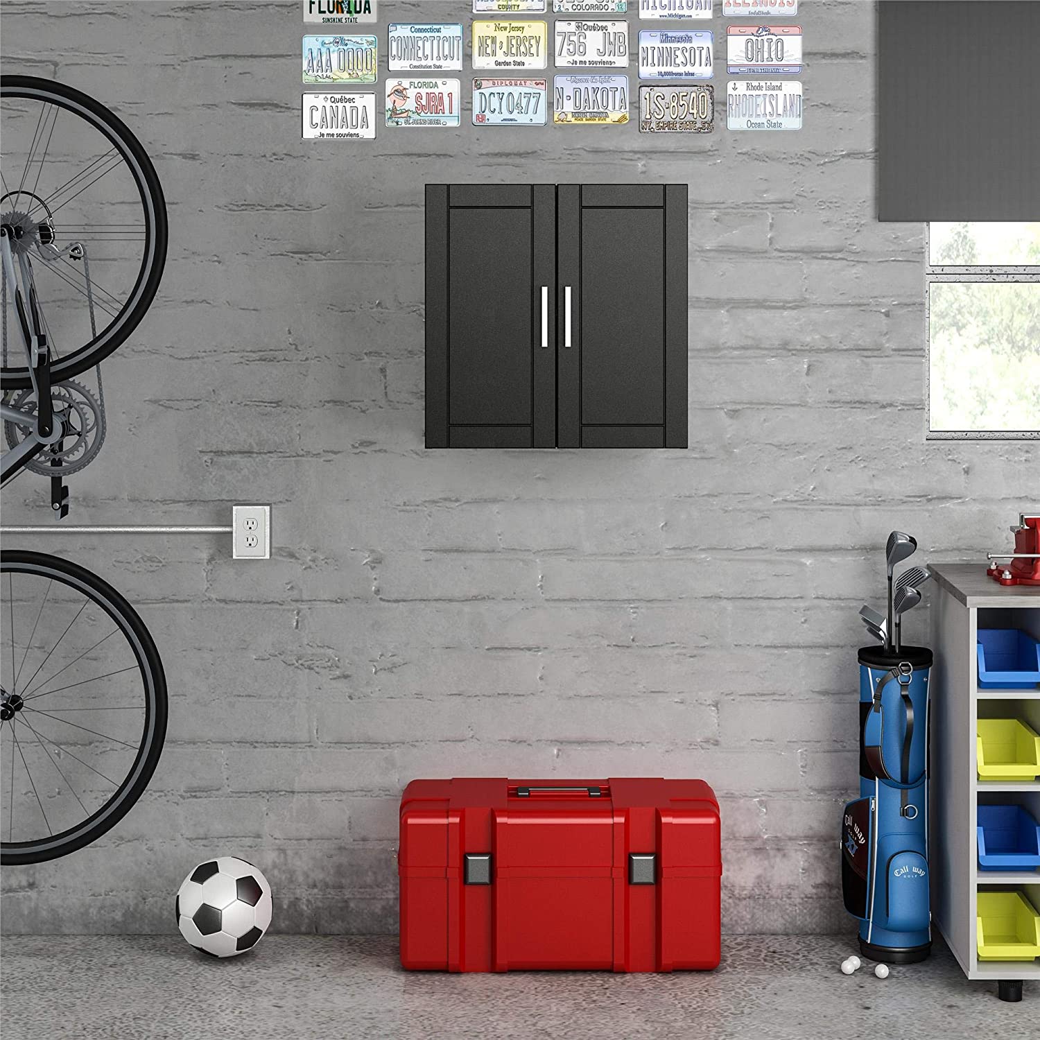 • Two shelves, 1 adjustable, behind the 2 doors provides optimal storage for cleaning supplies, office supplies, or crafting tools. EZ Hang system gives you a level and sturdy hang on the first try. Soft closing hinges prevent slamming doors