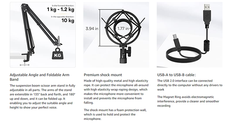 | Compatible Devices | For all Laptops, PC and Mobile phones. But if you want to connect with the phone, you need an OTG adapter (not included). Strong output, no distortion, low power consumption. PACKING LIST: Condenser Mic + Adjustable Scissor Arm Stand + Metal Shock Mount + Pop Filter + Foam Mic Windscreen + Table Mounting Clamp + USB-B to USB-A Cable. |