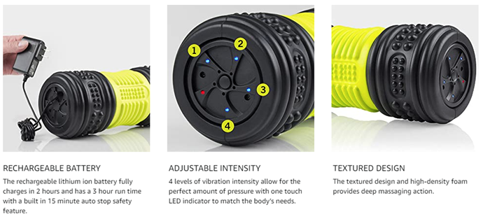 • FOAM ROLL IS BATTERY POWERED and features integrated lithium ion batteries with an included AC wall charger. Roller measures 11.5 x 4.75 and weighs 3 pounds