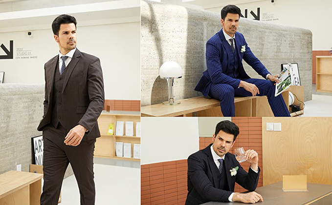 Button Fly closure, slim fit notch lapel flap pocket. Premium center vent two-button single breasted stripe suit jacket with matched four-button vest with back adjustable belt for better fit and classic trousers.