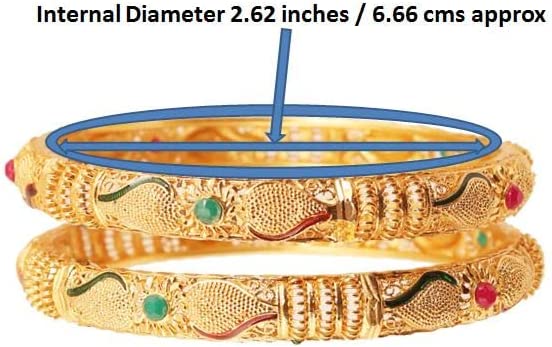NEW Touchstone "Golden Bangle Collection" Indian Bollywood Desire Beautifully Carved Conch Shell Inspired Faux Ruby Emerald Meena Designer Jewelry Bangle Bracelets. Set of 4. In Gold Tone For Women SIZE : LARGE. Indian Size 2-10. Inner Diameter 2.625 Inches or 6.67 cm. Please check against old Bangle before ordering to avoid disappointment