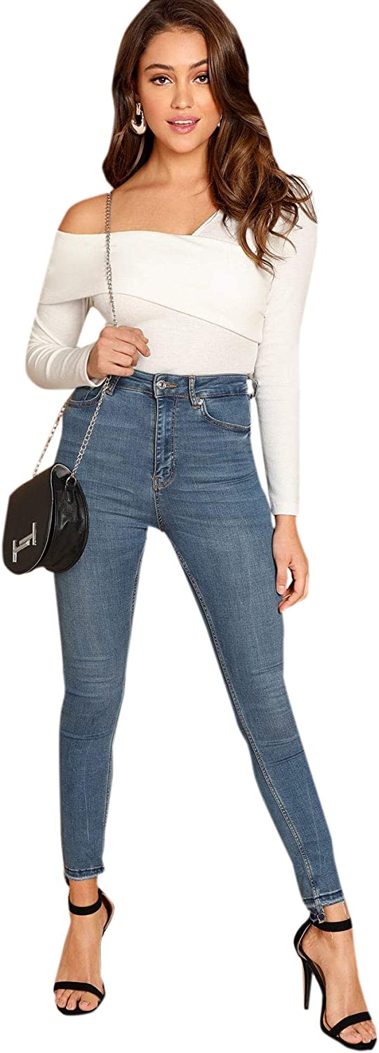 Romwe Women's Casual Cross Off Shoulder Deep V Neck Ribbed Knit Slim Wrap Tee Shirt Blouse