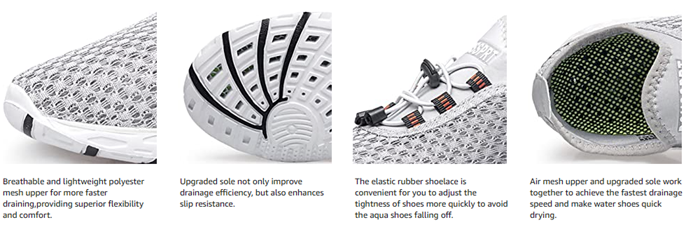 • 3. Open mesh on the upper and hole on the sole provides for superior breathability and quick drying.