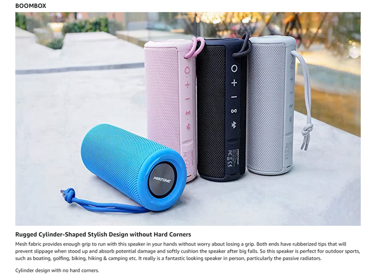 - [Immersive Sound] Featuring MIATONE unique audio processing, the sound quality of BOOMBOX bluetooth speaker is significantly better across the entire frequency range from dual precision acoustic stereo drivers. It handles crisp treble and mid frequencies excellently without noticeable crackle at max volume. Using DSP technology, dual advanced subwoofers and aluminum passive radiators on each ends boost deep and accurate bass that's true to your music. No exaggeration and distortion.