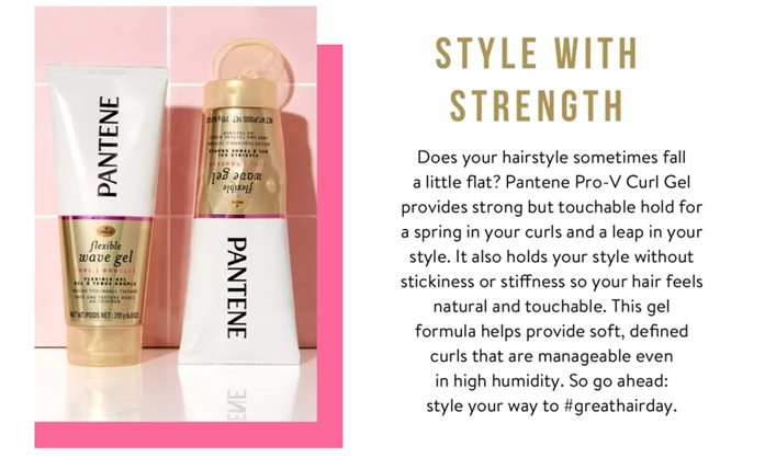 Does your hairstyle sometimes fall a little flat? Pantene Pro-V Curl Gel provides strong but touchable hold for a spring in your curls and a leap in your style. This formula is a lightweight spray that helps tame frizz and fly-aways so you can sculpt your curls and create lasting definition. It also holds your style without stickiness or stiffness so your hair feels natural and touchable. This gel formula helps provide soft, defined curls that are manageable even in high humidity. So go ahead: style your way to #greathairday.