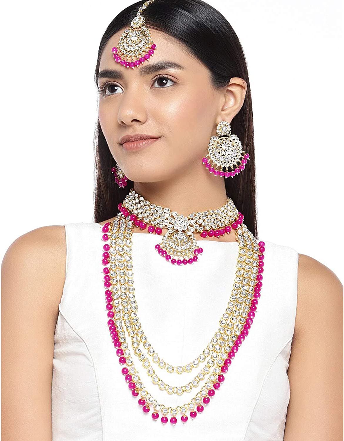 - DIMENSIONS(In Inches): Long Necklace Length - 26", Choker Necklace Length - 10" , Necklace Width - 3", Earring Height - 3", Earring Width - 2.25" , Mang Tika Length - 7" & Mang Tika Width - 2.25"