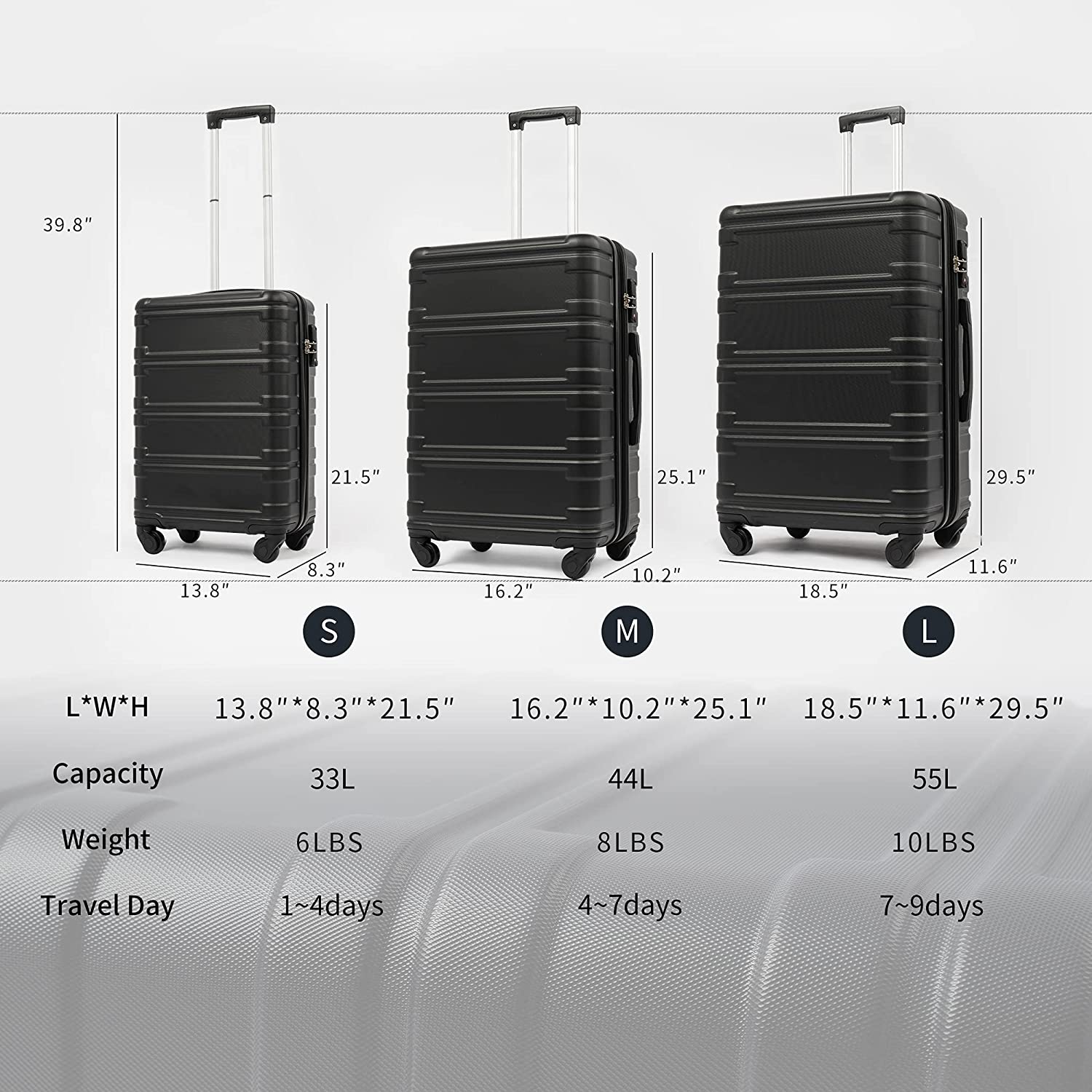 • The complete 3 piece suitcase set will be shipped with each suitcase inside one another to save space for your convenience.