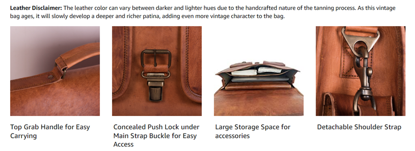 • ELEGANT DESIGN : Now this is one design which can never go out of style . In addition this leather as a characteristic ages wondefully with use which makes the bags look vintage and unique .