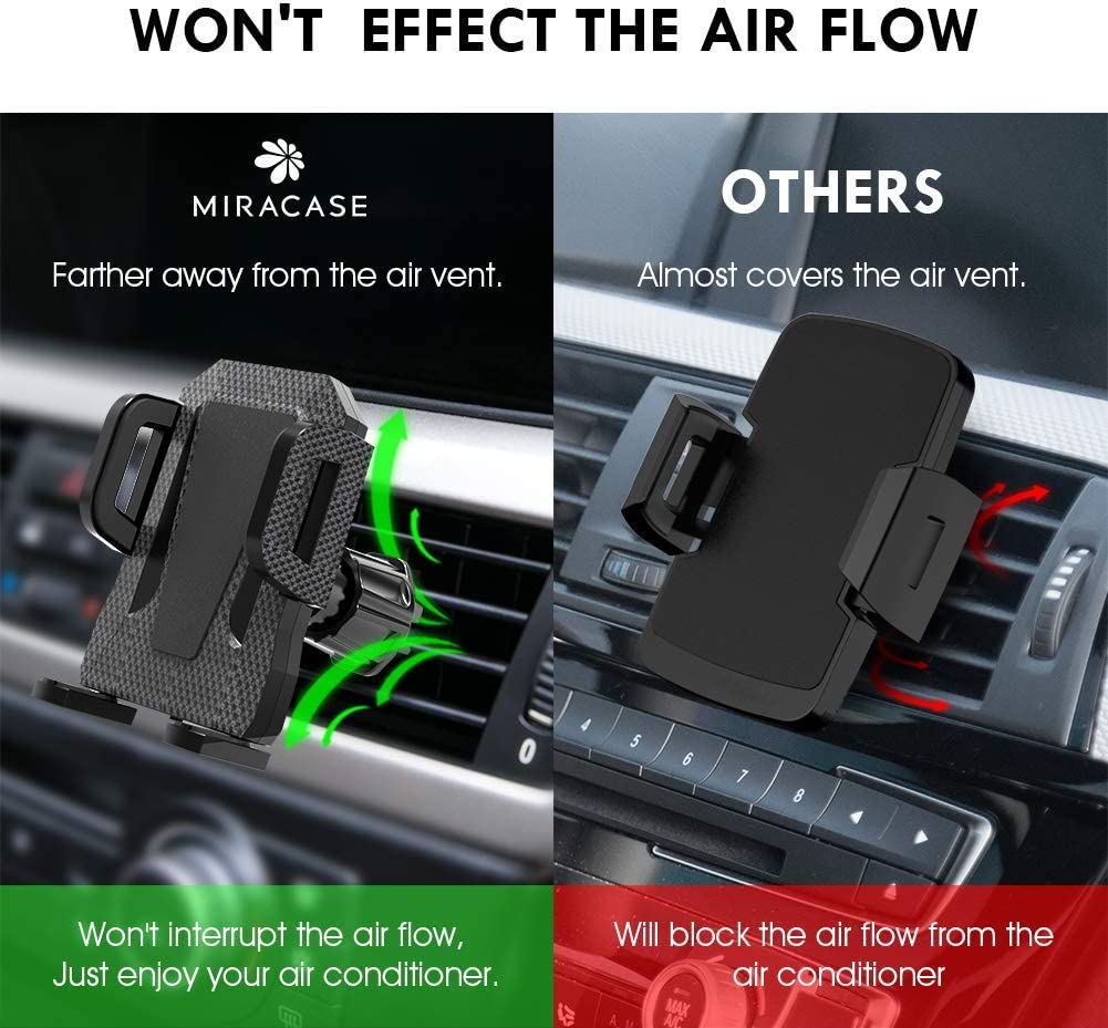 • 【Never Fall Off-Classic Series Design】Miracase car phone mount adopts latest locking design. The clip hook will catch one of car air vent blades. The spring clip plate and the tightening nut will provide absolute fixation. It will never fall out like other products no matter how bumpy the road is.