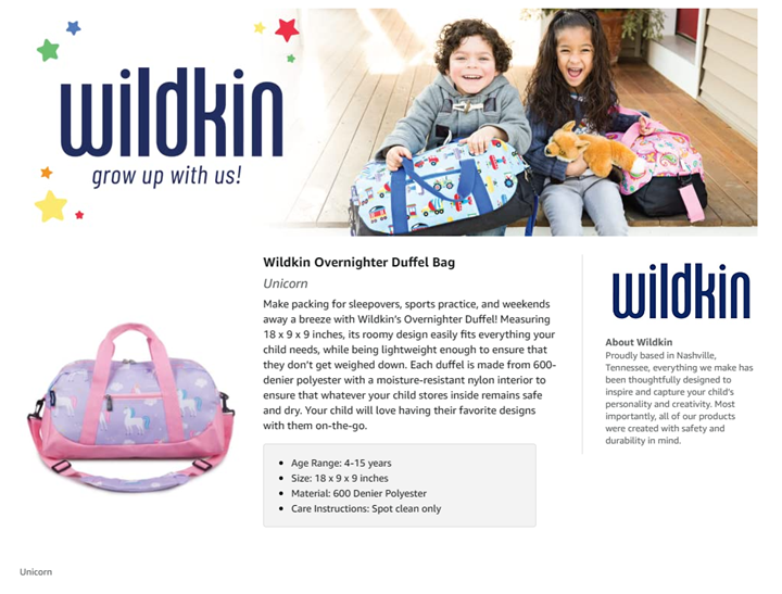 • BUILT TO LAST – At Wildkin, we know that details matter to you and your child, and we made sure that our overnight bag was designed with that in mind. The travel bag overnight bags are made from 600-denier polyester with a moisture-resistant nylon interior to ensure that whatever your child stores inside remains safe and dry. The kids overnight duffel bag ultra-durable design means a little rough-and-tumble is OK – these travel bags were built to handle it!