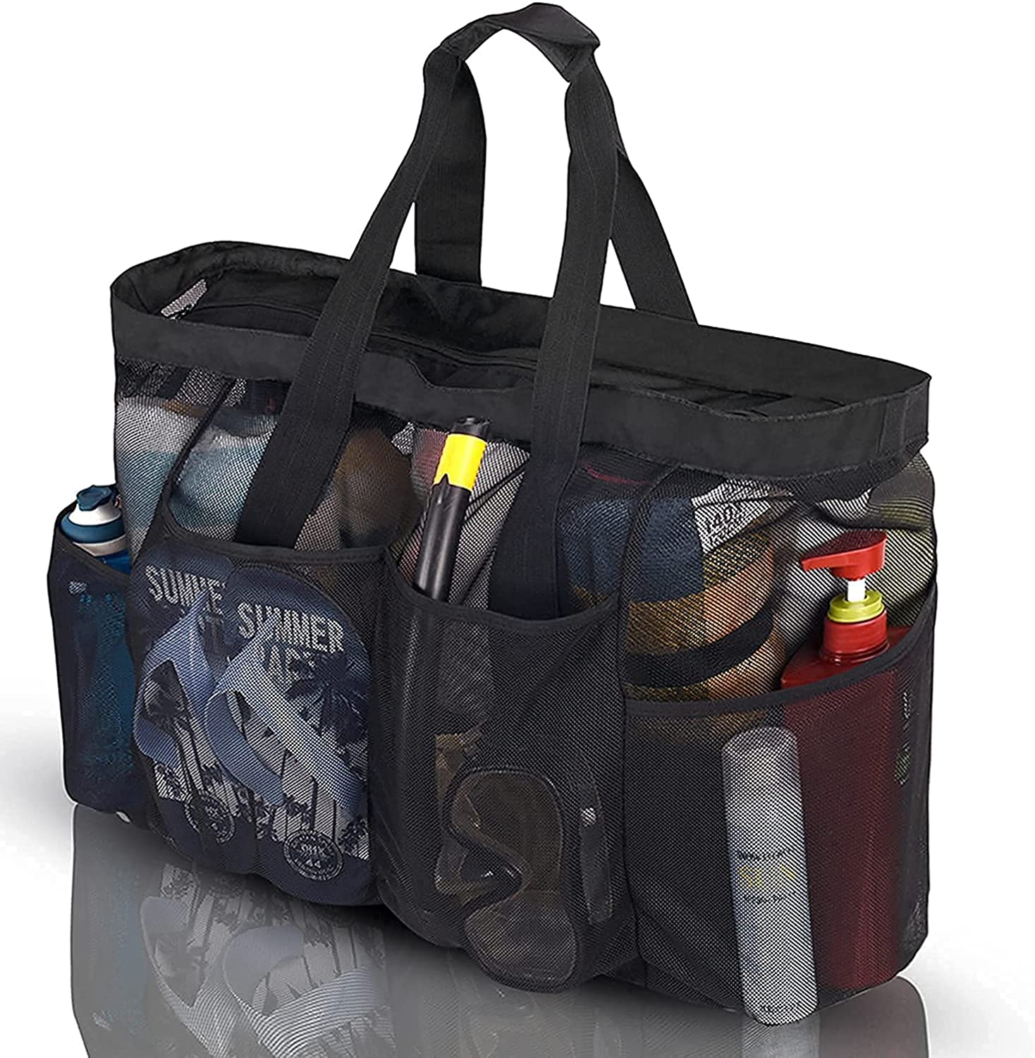 • 【 WITH MORE EXTRA POCKETS 】 - Our black mesh beach bag with 4 outside pockets and 1 inside zippered pocket. 4 deep outside pockets for your extra stuff like water shoes, water bottles... The 1 inside zippered pocket for your valuables like phone, wallet and key...