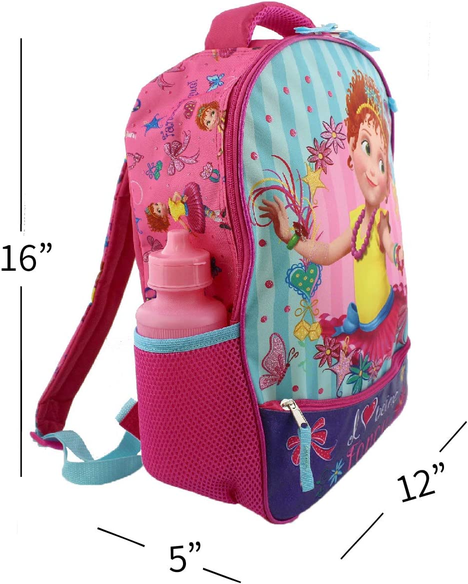 Get ready for the day with this stylish Yankee Toy Box exclusive Fancy Nancy backpack and snack bag school set! This set includes a 16 inch backpack, a fold-able insulated snack bag, a soft utility pencil case, a drawstring sack, and a pop top water bottle. You can easily carry books, gym clothes, pencils, and other school supplies! The day pack features a roomy main compartment, two side pockets, and a front zip compartment that is perfect for smaller supplies. The book bag can be hung up when not in use by the padded locker loop. The matching snack bag makes snack time fun and exciting with a thinly insulated interior, hook and loop closure, and a holding strap for easy carrying. This Fancy Nancy school bag is designed in durable fabric with adjustable padded shoulder straps and a padded back for added comfort. The side mesh pockets are made from durable athletic mesh. The soft accessory case and is great for storing smaller items. This set features your favorite Disney Jr. Fancy Nancy character: Fancy Nancy! It's the perfect travel, school, or camp set for any girl or toddler girl that loves Fancy Nancy!
