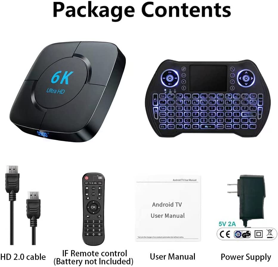 • What You Get:1*TV BOX,1*IF Remote Control,1* Mini Keyboard,1*HD Cable,1*User Manual,1*US power supply ,and our professional after-sales team,we will fix your issue within 24 hours.(AAA dry battery not included)