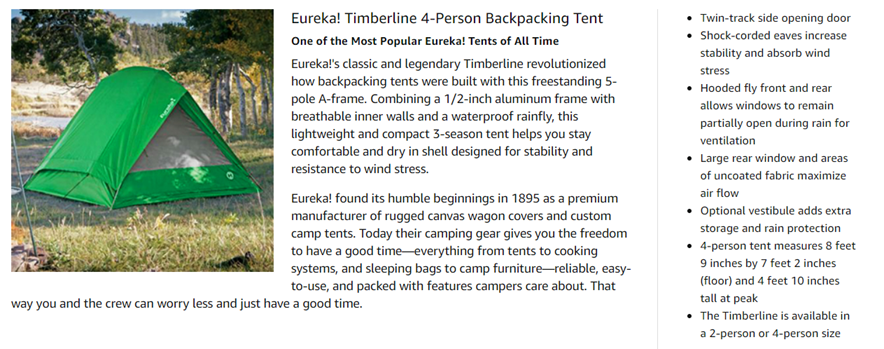 • Tent, pole, and stake bags includedSpecifications:Area: 38 square feetFloor size: 7 feet by 5 feet, 3 inchesCenter height: 3 feet, 6 inchesWall fabrics: 1.9-ounce breathable nylon/1.9-ounce permeable taffeta nylonFloor fabrics: 1.9-ounce Taffeta nylon with 1200 mm coatingFly fabrics: 1.9-ounce Polyester with 1200 mm coatingPack size: 6 by 24 inchesWeight: 5 pounds, 13 ouncesAbout EurekaThough the exact year is unknown, Eureka’s long history begins prior to 1895 in Binghamton, New York, where the company still resides today. Then known as the Eureka Tent & Awning Company, its first wares were canvas products--most notably, Conestoga wagon covers and horse blankets for nineteenth century American frontiersmen--as well as American flags, store awnings, and camping tents.The company increased production of its custom canvas products locally throughout the 1930s and during the 1940 and even fabricated and erected the IBM "tent cities" just outside Binghamton. The seven acres of tents housed thousands of IBM salesmen during the company’s annual stockholders meeting, which had since outgrown its previous locale. In the 1940s, with the advent of World War II and the increased demand for hospital ward tents, Eureka expanded operations and began shipping tents worldwide. Ultimately, upon the post-war return of the GIs and the resultant housing shortage, Eureka turned its attention to the home front during the 1950s by supplying awnings for the multitude of mobile homes that were purchased.In 1960, Eureka’s new and innovative Draw-Tite tent, with its practical, free standing external frame, was used in a Himalayan Expedition to Nepal by world renowned Sir Edmund Hillary, the first person documented to summit Mt. Everest only six years earlier. In 1963, Eureka made history during its own Mt. Everest ascent, with more than 60 of its tents sheltering participants from fierce 60+ mph winds and temperatures reaching below -20°F during the first all American Mt. Everest Expedition.For backpackers and families, Eureka introduced its legendary Timberline tent in the 1970s. Truly the first StormShield design, this completely self-supporting and lightweight backpacking tent became one of the most popular tents the entire industry with sales reaching over 1 million by its ten year anniversary.Eureka tents have also traveled as part of several historic expeditions, including the American Women’s Himalayan Expedition to Annapurna I in 1978 and the first Mt. Everest ascents by a Canadian and American woman in 1986 and 1988. In recent history, tents specially designed and donated by Eureka sheltered Eric Simonson and his team on two historic research expeditions to Mount Everest, this time in a quest for truth regarding the 1924 attempted summit of early English explorers George Mallory and Andrew Irvine. During the 1999 expedition, the team made history finding the remains of George Mallory, but the complete mystery remained unsolved. Returning in 2001 to search for more clues, the team found amazing historical artifacts which are now on display at the Smithsonian.