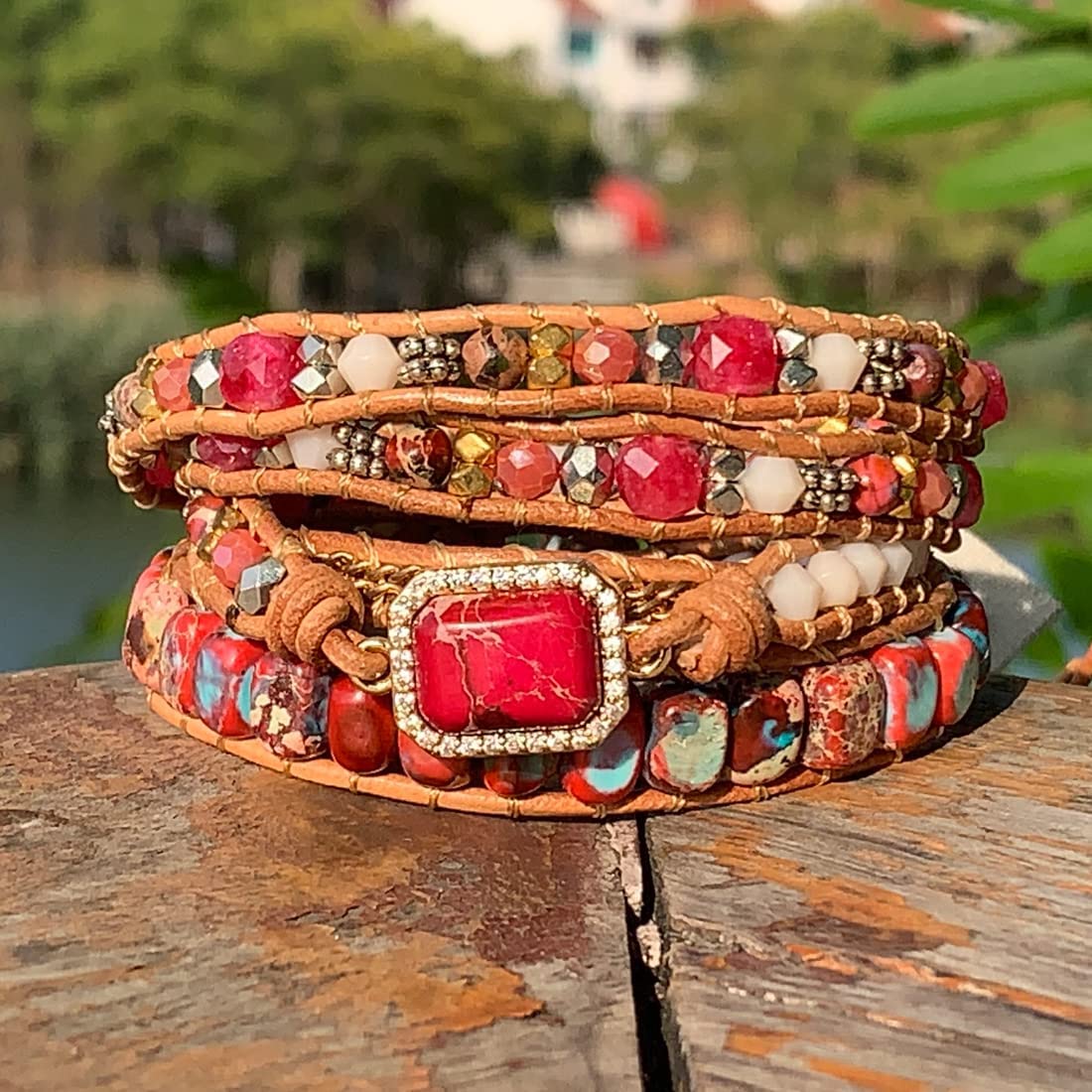 • 【SIZE】wrap around wrist 5 times (depend on your wrist size), LENGTH AROUND 32.2"-35.8" 3 adjustable options with a button to secure