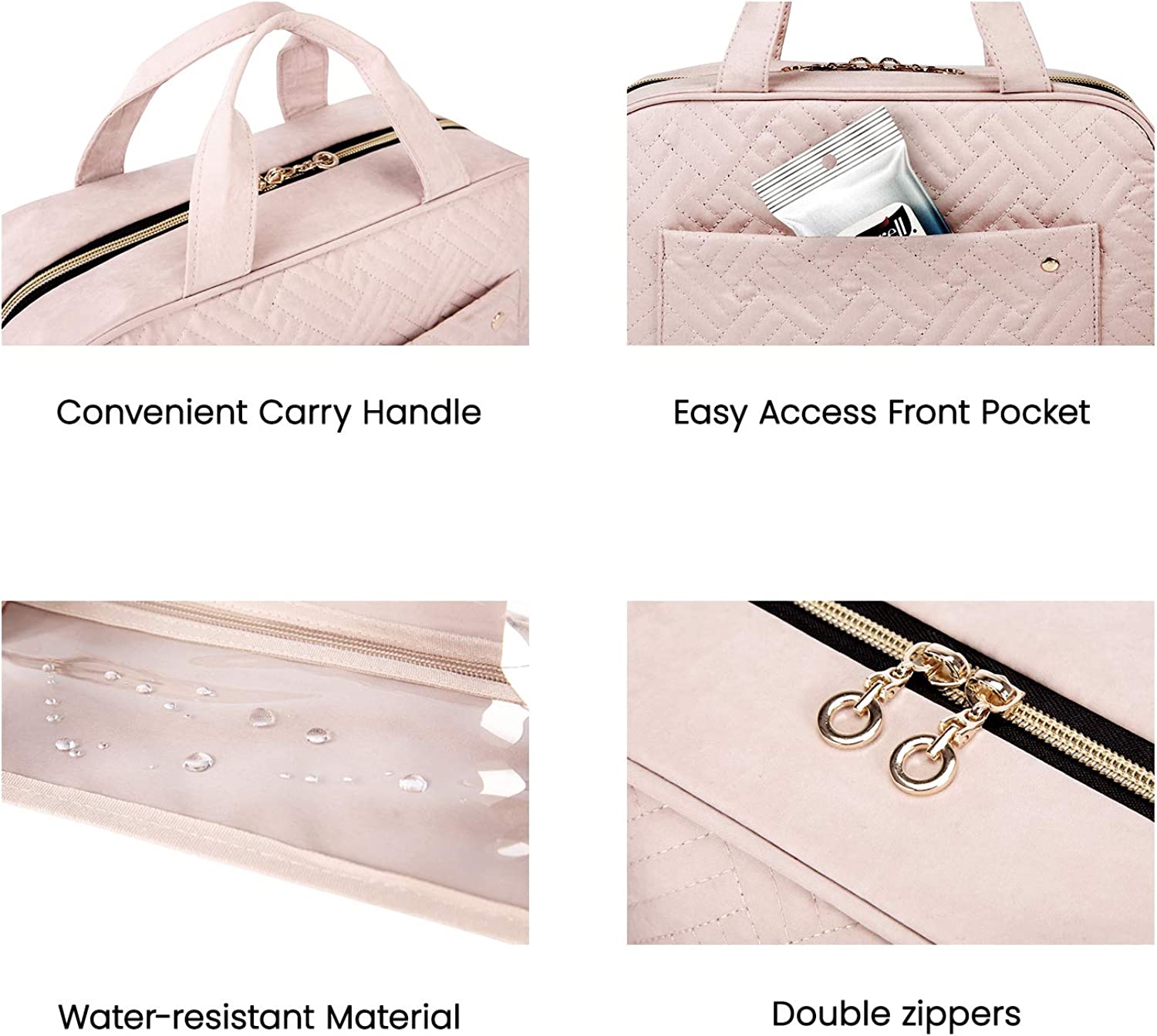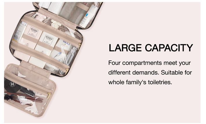 • Special Design - Inner main pockets with elastic straps hold bottles upright; Double zipper compartment for easy access the items even not full-opened the bag; Transparent sides for providing clear overview of contents.