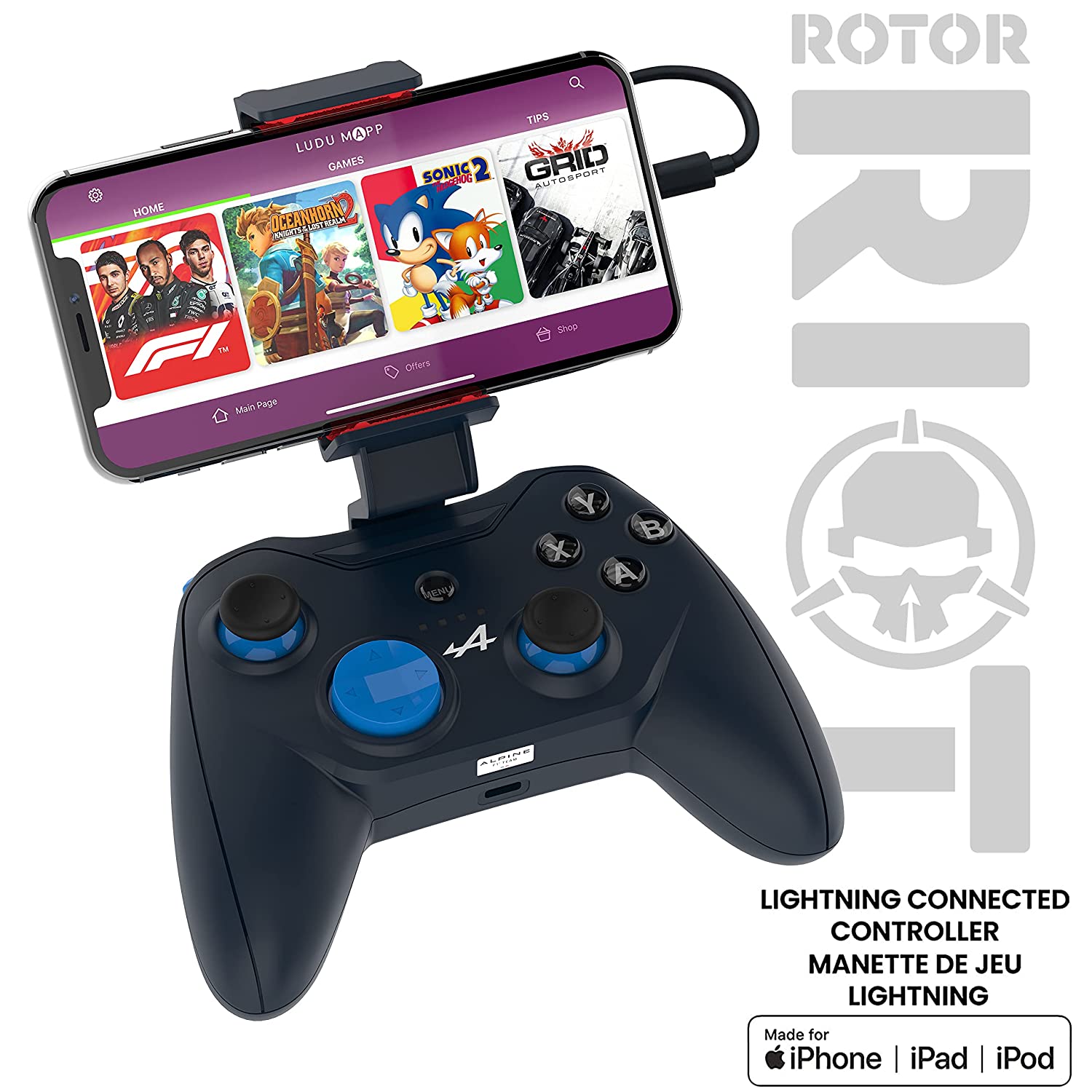 RiotPWR Mfi Certified Gamepad Controller for iOS iPhone - Wired with L3 + R3 Buttons, Power Pass Through Charging, Improved 8 Way D-Pad, and redesigned ZeroG Mobile Device