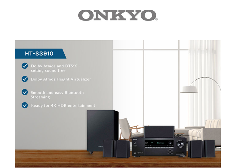Onkyo HT-S3910 Home Audio Theater Receiver and Speaker Package. Experience the ultimate in pure sound flexibility. The powerful yet compact HT-S3910 transforms tinny TV sound into a thrilling sonic sensation with Dolby Atmos and DTS playback through 3.1.2 channels. Legacy soundtracks are remapped to localize sound and add height dimensionality, or enjoy 3D immersion without height or rear speakers connected thanks to Dolby Atmos Height Virtualizer and DTS Virtual technologies. Everything you need is in the box, right down to cables to connect factory-matched speakers. These full-range units love high-current power, so turn it up and enjoy home entertainment as it’s meant to be. FEATURES: Package Includes: (1) Front/Center Speaker, (4) Surround Speakers, (1) Subwoofer and (1) Receiver. Cables included. 4K HDR Support for HDR (High Dynamic Range) video. 4K/60p and HDR (HDR10, hlg, Dolby vision, BT.2020). Power an HDMI network dongle via USB terminal or enjoy streaming audio with Bluetooth technology. Advanced Music Optimizer works magic on lossy audio.