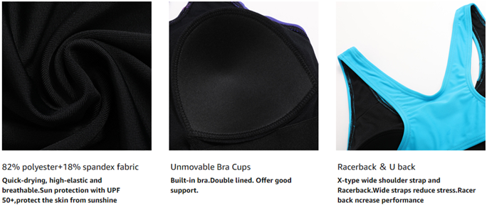 • MATERIAL:82% polyester 18% spandex.Lining:100% Polyester,quick-dry fabric stretch stays comfortable,chlorine-resistant fabric helps retain shape and prevents fading .Our model information:Height 5'74, Bust 35.43",Waist 23.62",Hips 35.43". [Wearing size S].