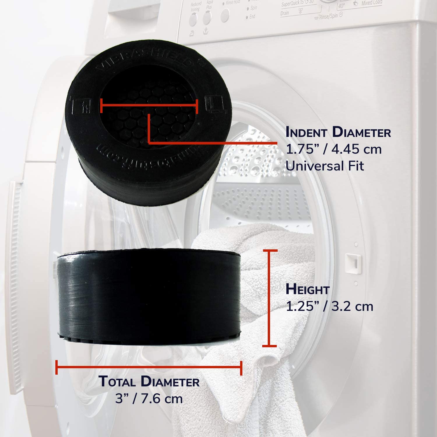 - ? UNIVERSAL SIZE ? Fits all appliance feet up to 1.75" in diameter for front load or top loader clothes washers, dryers, 2-in-1 combo or other appliances from any brand manufacturer; Compatible with washing and drying laundry machines or other appliances that are installed side by side, stacked, or standalone and with or without pedestals; ? REMINDER ? Order 2 sets of VibraShield antivibration non-slip pads if you have a side by side washer and dryer set to keep them both the same height