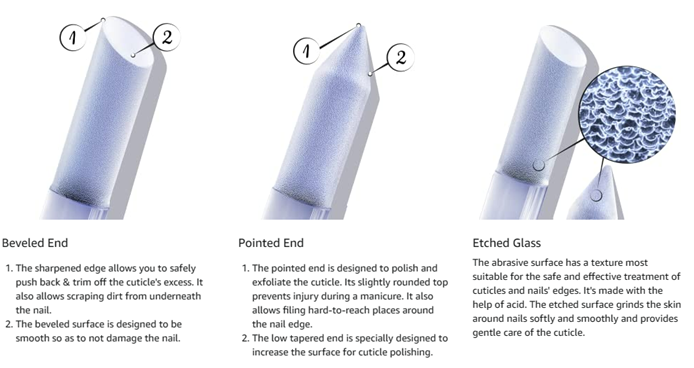 • LIFETIME GUARANTEE - Effective filing surface allows for precision shaping. Each cuticle pusher comes with a lifetime guarantee which covers the filing surface. All glass cuticle pushers we sell are chemically hardened which greatly increases their mechanical resistance.