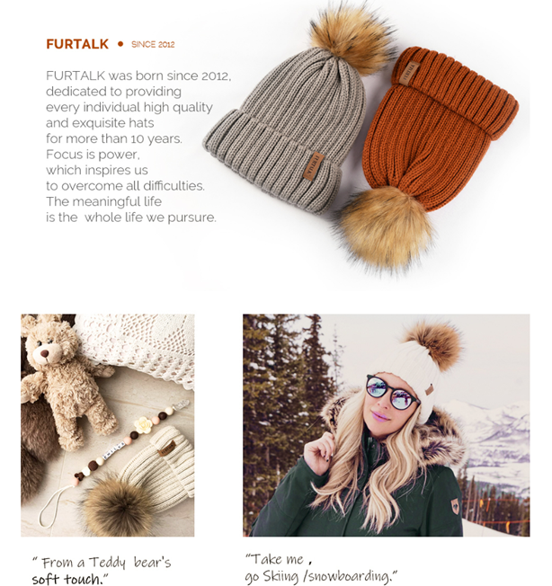 Womens Faux Fur Pom Pom Hat Winter Knitted bobble Hat beanie for girls Detachable pom pom for washing purposes.Ribbed and with a large turn-up, it is very soft and stretchy. Suitable for both womens and girls. One size. Head circumference: 52-60cm. Composition:  Hat: 100% acrylic Pom: High quality faux fur Pack: 1 pcs cable knitted pom pom hat Please note all pom poms have subtle differences in colour and size. Brand Introduction: FURTALK is a U.S.Registered young brand which setted in 2012,We focus on offering high qualified wool yarns products to young people as well as bring warm and fashion to your daily life.FURTALK promise high qualified and products and service with high reputation.