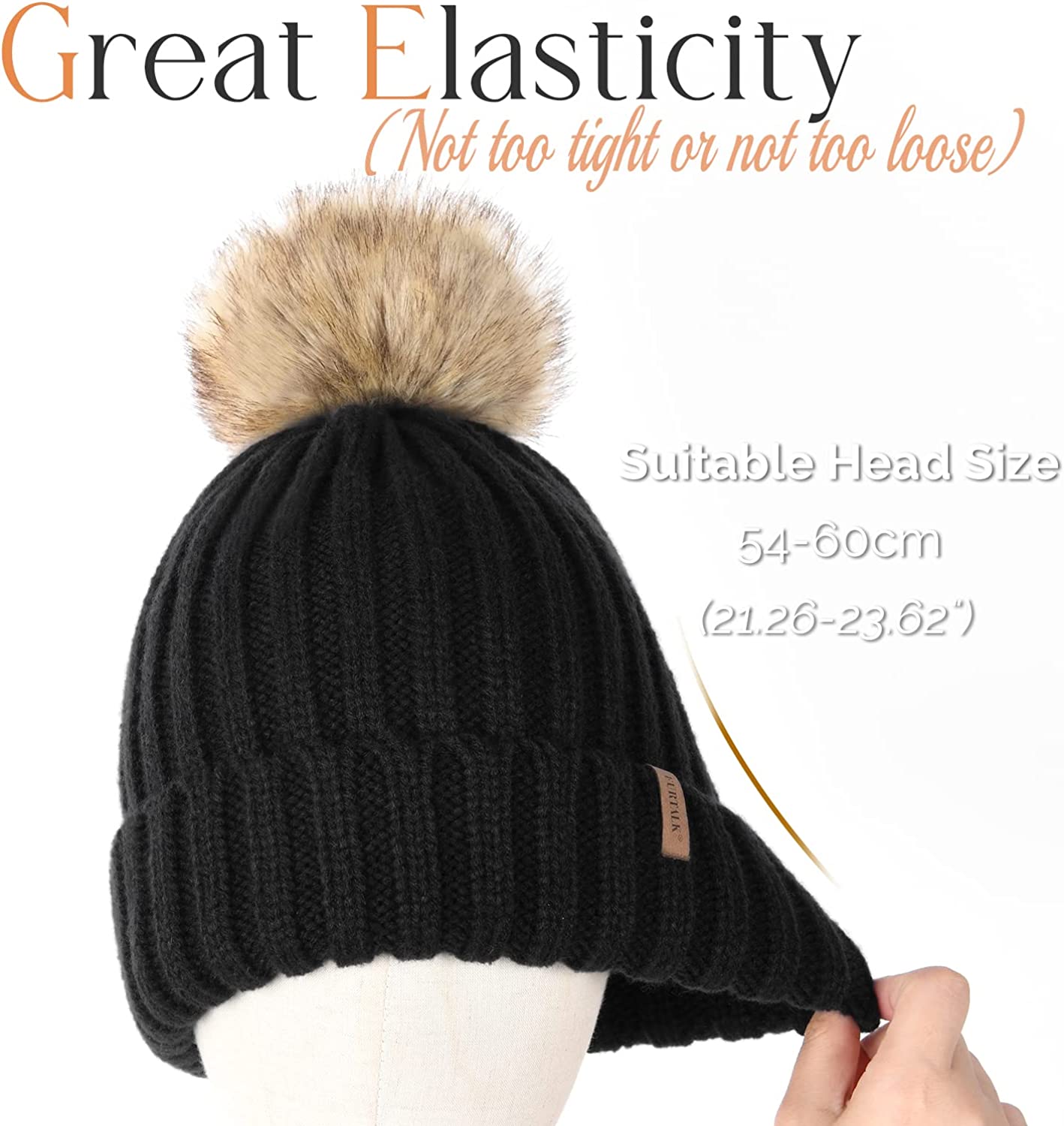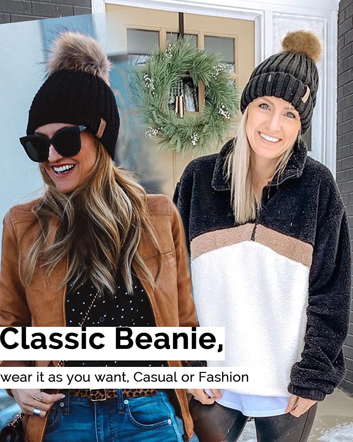 • ?PREMIUM MATERIAL: The winter beanie hat is made of 100% soft acrylic with Faux racoon fur pompom on the top of the hat;It is durable and stretch well.And the warm fleece lining of this fleece hat is skin-friendly,soft and thermal,which can protect you even in the coldest winter;