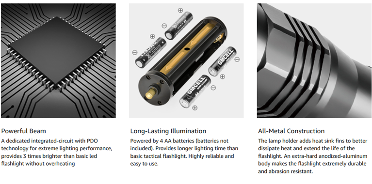 • 【BRIGHTEST FLASHLIGHT】 With high power OSRAM P8 LED, the S3000 provides up to 1600 real lumens(Max) but only need 4 * AA batteries (battery not included). This mid-size flashlight is high on power but still compact enough to fit in your hands, backpack, survival kit, or glove compartment.