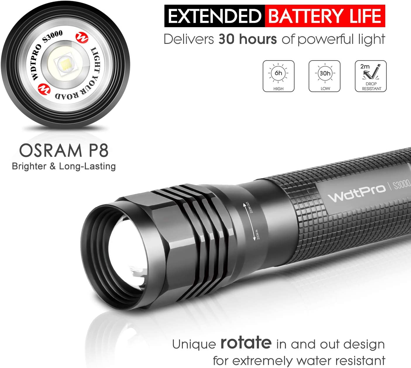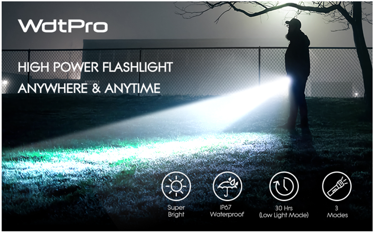 WdtPro High-Powered LED Flashlight S3000, Super Bright Flashlights - High Lumen, IP67 Water Resistant, 3 Modes and Zoomable for Camping, Emergency, Hiking, Gift