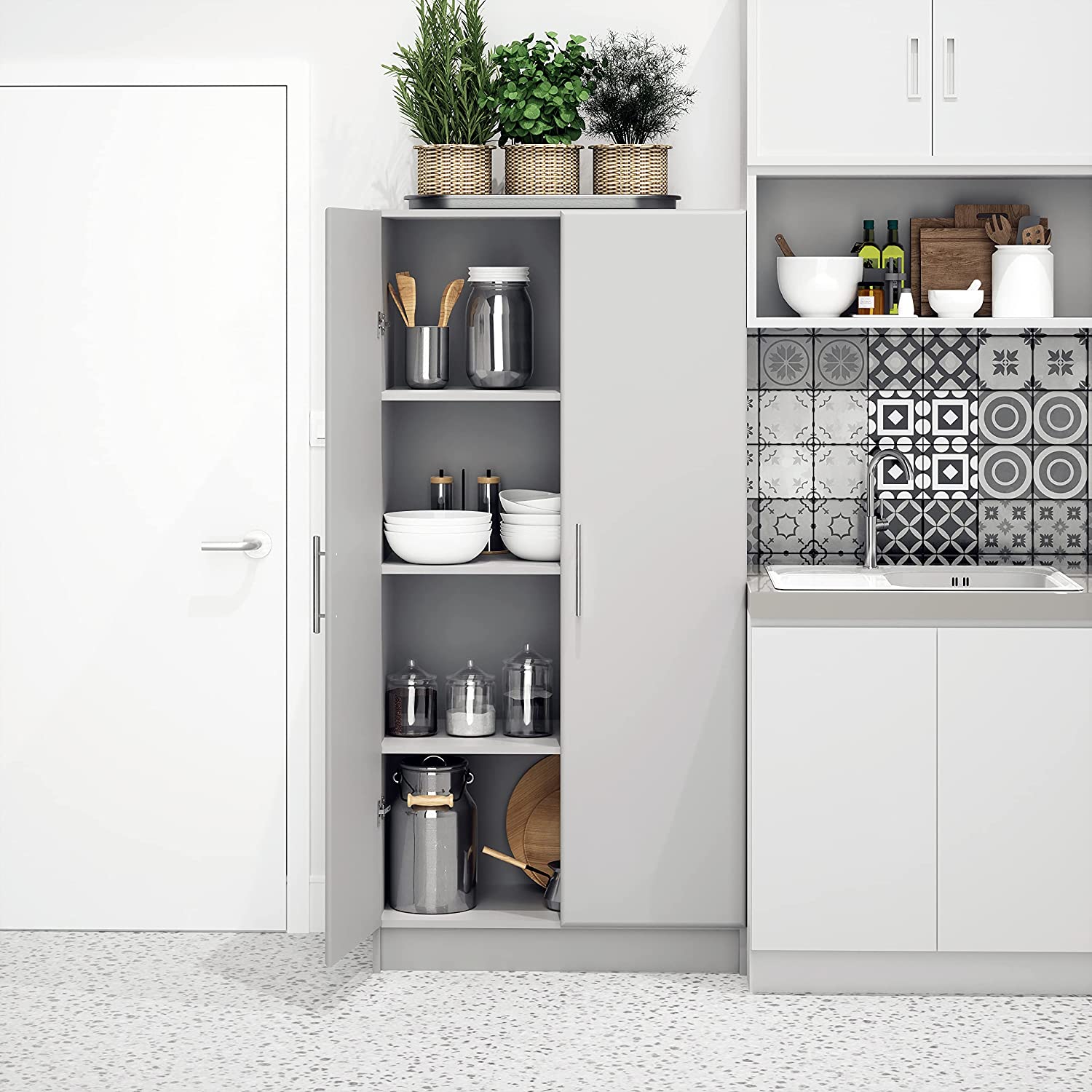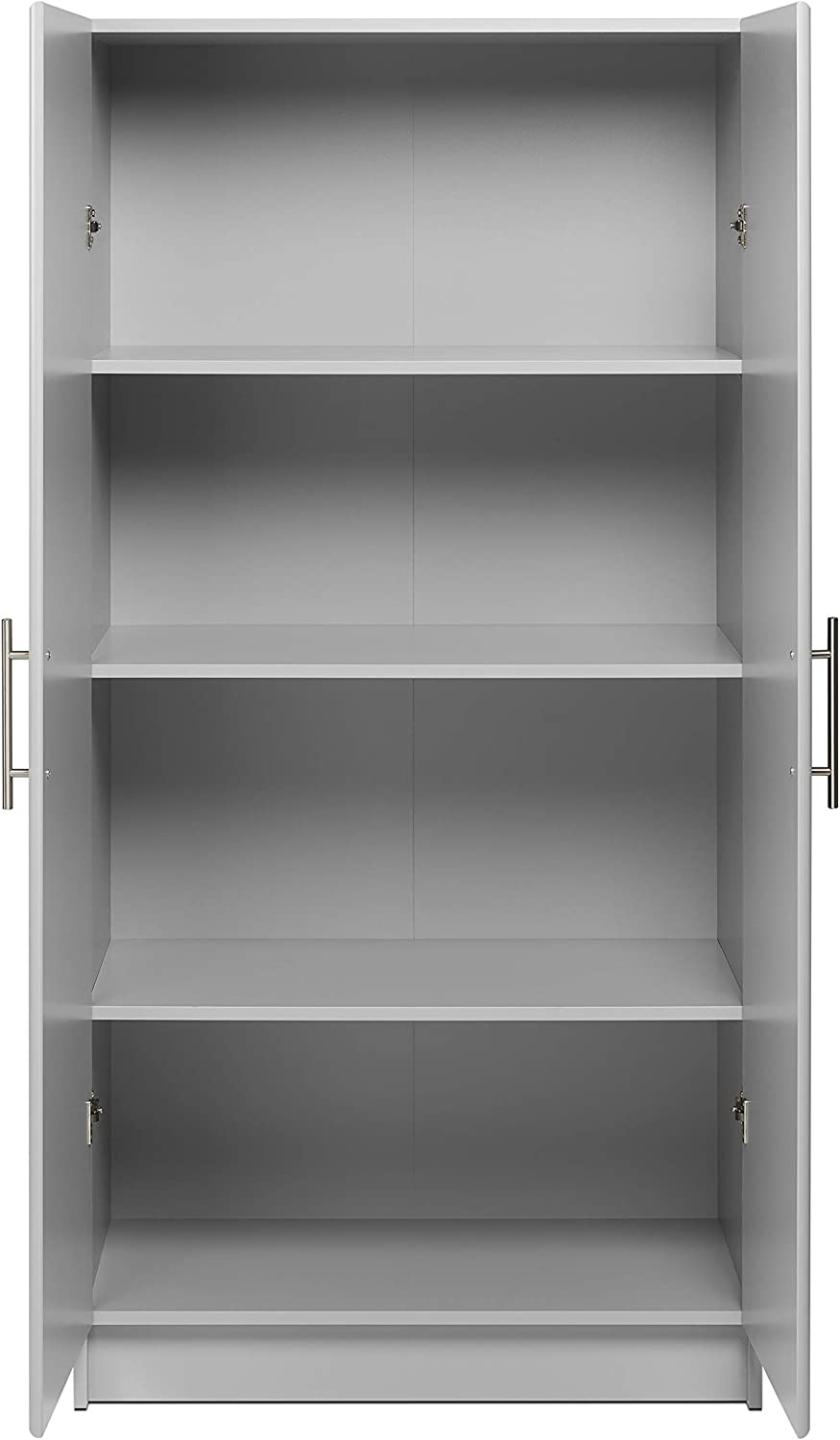 FREESTANDING STORAGE CABINET: Features 2 soft-edge doors on adjustable 6-way European style hinges, 2 adjustable shelves, and one fixed shelf all in a light gray laminate finish with satin nickel-finished metal handles