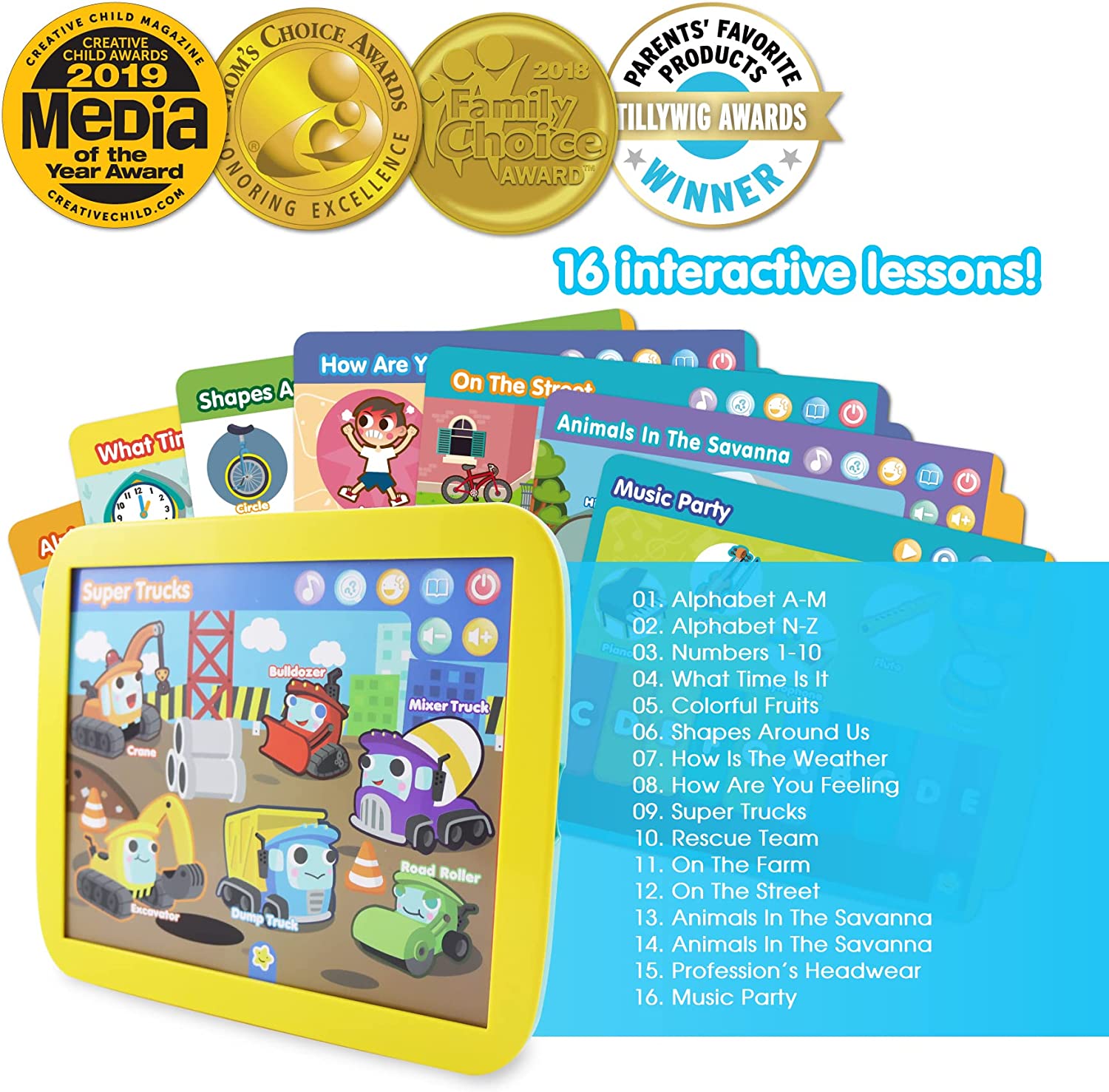 Comes with 8 durable plastic (PP) learning cards (16 lesson pages) and volume control. Take learning activities on the go; perfect for long car or plane rides. Great gift idea for preschoolers; boys and girls.