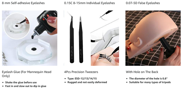 • ? THE BEST CHOICE IS ALL IN ONE - Mannequin Head, Disposable Mascara Wands, Glue Rings, Eyelash Glue (For mannequin head only), Tweezers, False Eyelashes, Air Blower, Eye Patches Pads, Silicone Forehead Sticker, Eyelash Applicatior Wand AND SO ON. The ultimate value packed kit!