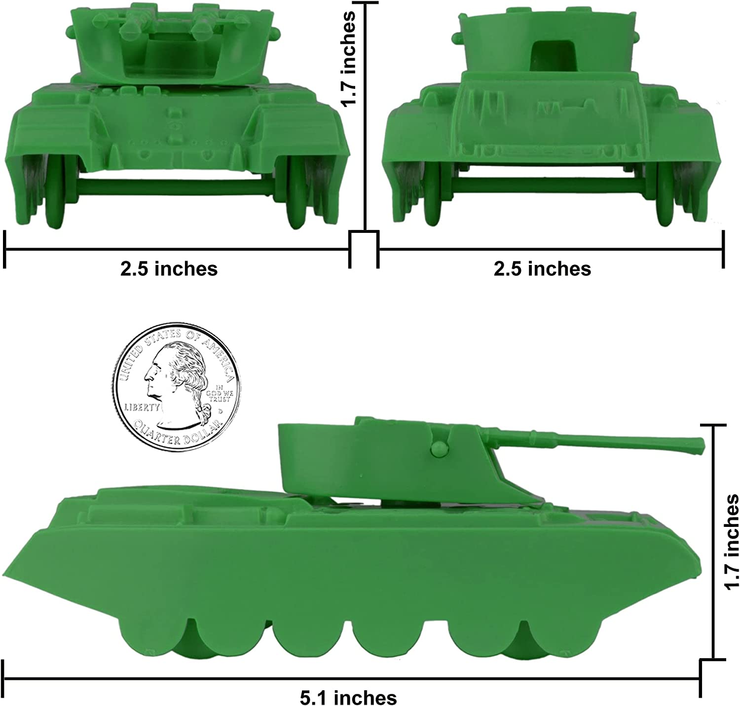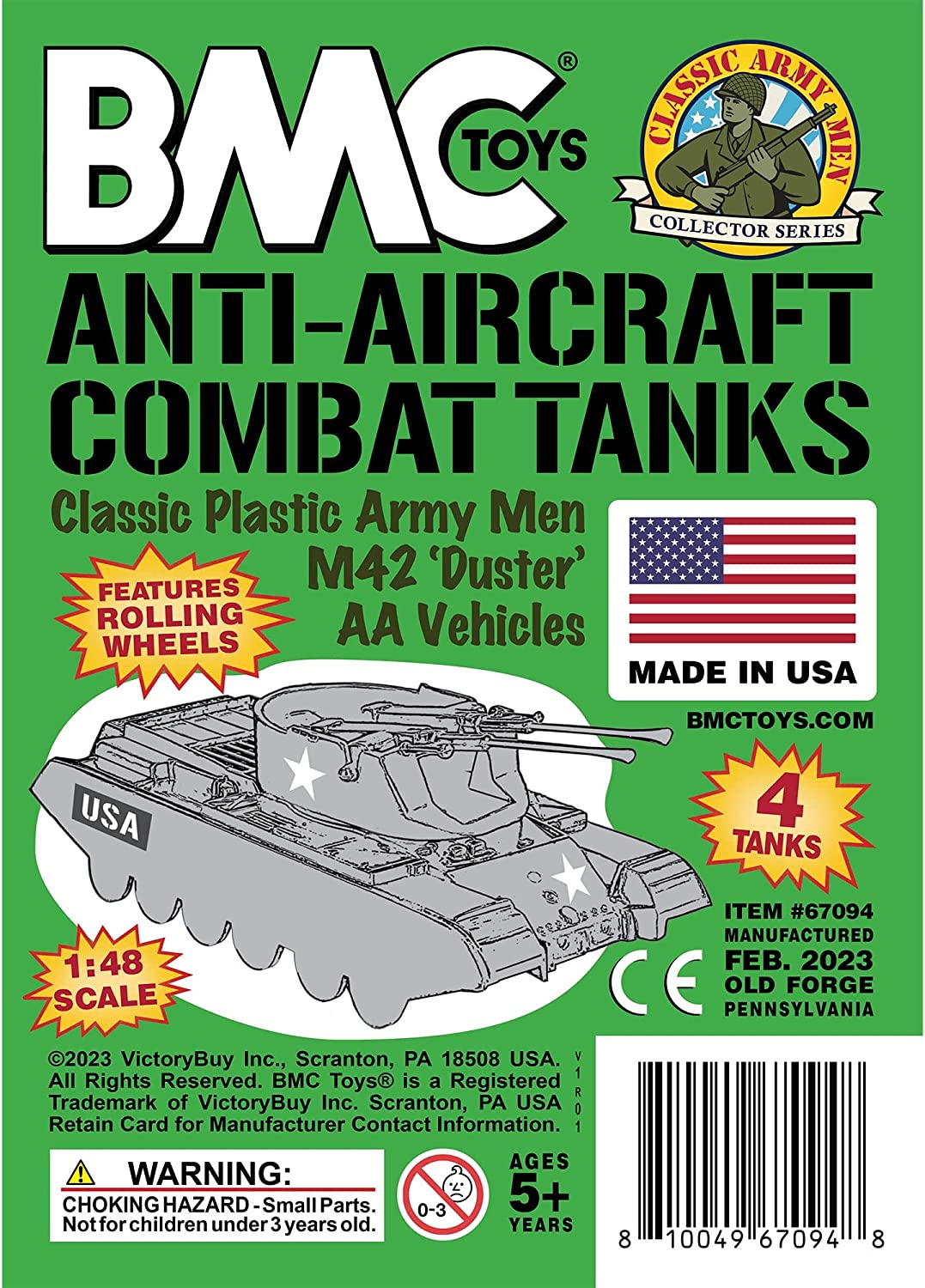 From the CLASSIC ARMY MEN COLLECTOR SERIES, BMC Toys brings back another American toy from yesteryear. This pack of 4 'Duster' Anti-Aircraft Tanks is proudly manufactugreen in the United States. The set includes 4 green vehicles and features guns that pivot, turrets that rotate, and rolling wheels. Tanks are approximately 1:48 scale and are made from slightly flexible HDPE plastic with medium detail and very little flashing.