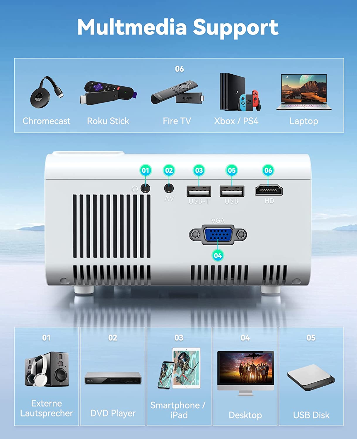 • 【CONNECT TO ANY DEVICE】This outdoor projector works with a wide range of devices including TV sticks, PCs, laptops, tablets, Blue-ray DVD players, TF cards, USB flash drives, PS4/XBOX/WII, media players (music, pictures, video, TXT), and headphones. You can even connect it to your iPad, iPhone, or Android smartphone (additional HDMI adapter required). Not recommended for PPT business presentations.