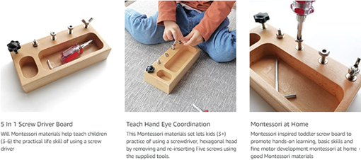 - Montessori Screw Board Will Help Teach Children (3-6) The Practical Life Skill of Using A Screw Driver. The Montessori Materials Board Will Also Teach Hand Eye Coordination While Working on Fine Motor Skills.