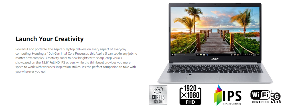 Acer Aspire 5 A515-54-59W2 comes with these high level specs 10th Generation Intel Core i5-10210U Processor 1 6GHz with Turbo Boost Technology up to 4 2GHz (6MB Smart Cache) Windows 10 Home 15 6" Full HD (1920 x 1080) widescreen LED-backlit IPS Display Intel UHD Graphics 620 8GB DDR4 Memory 256GB PCIe NVMe SSD True Harmony Technology Two Built-in Stereo Speakers Acer Purified Voice Technology with Two Built-in Microphones Acer Fingerprint Reader supporting Windows Hello Intel Wireless Wi-Fi 6 AX201 802 11ax Dual-Band 2 4GHz and 5GHz featuring 2x2 MU-MIMO technology (Max Speed up to 2 4Gbps) 10/100/1000 Gigabit Ethernet LAN (RJ-45 port) Bluetooth 4 2 Back-lit Keyboard HD Webcam (1280 x 720) 1 - USB 3 1 (Type-C) port (Gen 1 up to 5 Gbps) 2 - USB 3 1 Gen 1 Port (one with Power-off Charging) 1 - USB 2 0 Port 1 - HDMI Port with HDCP support Lithium-Ion Battery Up to 9 5-hours Battery Life 3 97 lbs | 1 8 kg (system unit only) (NX HN3AA 003).