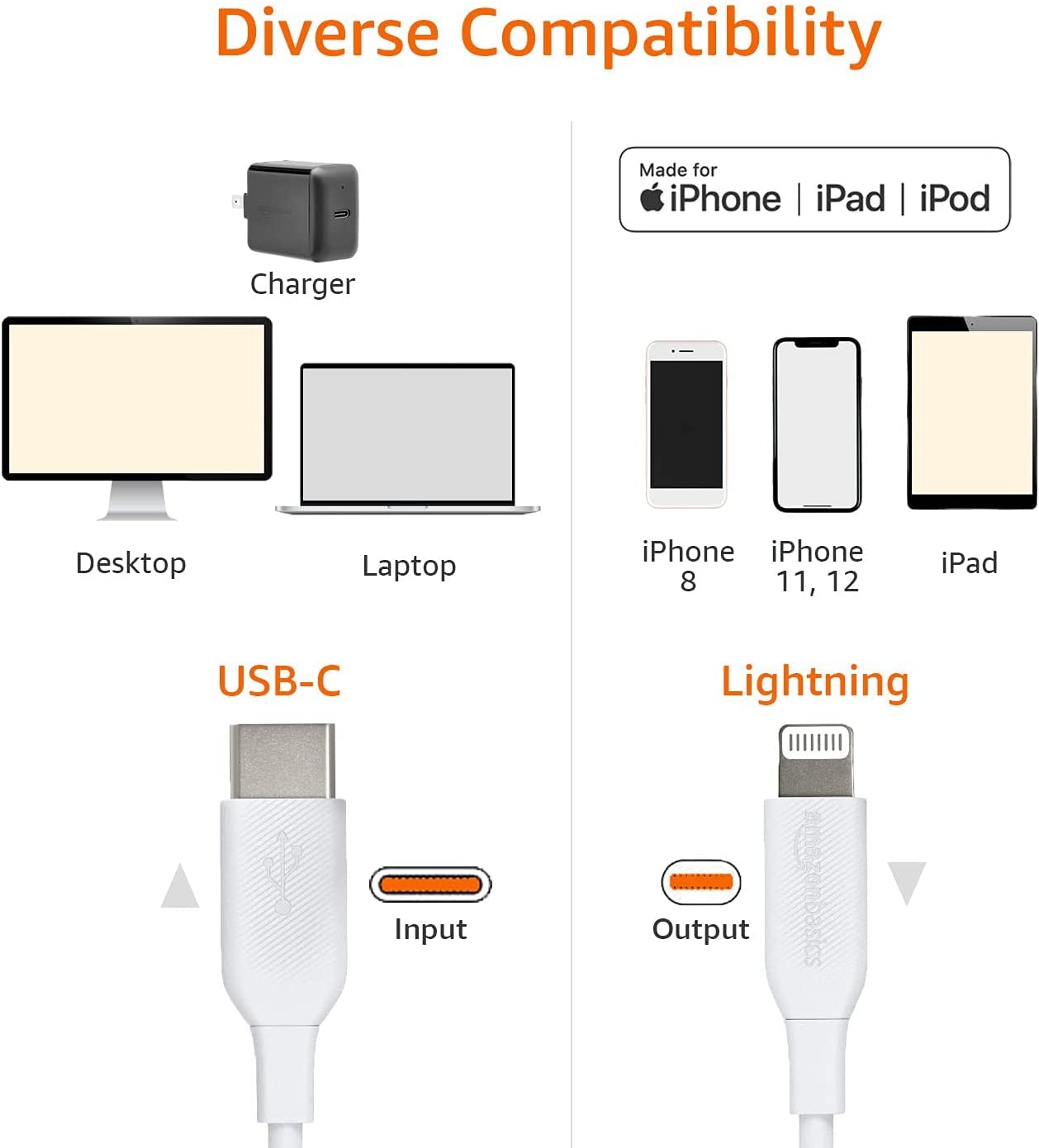 Amazon Basics USB-C to Lightning Cable Cord, MFi Certified Charger for Apple iPhone 14 13 12 11 X Xs Pro, Pro Max, Plus, iPad, White, 6-Ft