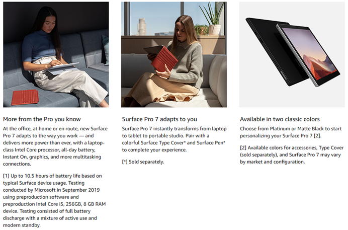 At the office, at home or en route, new Surface Pro 7 adapts to the way you work with laptop-to-tablet versatility. And now, it delivers more power than ever, with a laptop-class Intel Core processor, all-day battery, Instant On, improved graphics, and standby time — plus more multitasking connections, including both USB-C and USB-A ports.