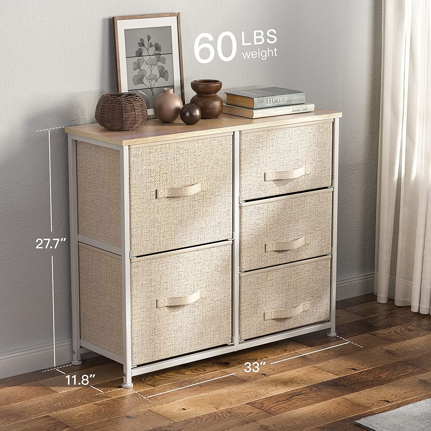 • Wood top and fabric drawers