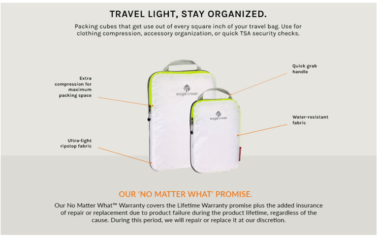 • NO MATTER WHAT WARRANTY - Eagle Creek's Warranty covers the Lifetime Warranty promise plus the added insurance of repair or replacement due to product failure during the product lifetime, regardless of the cause