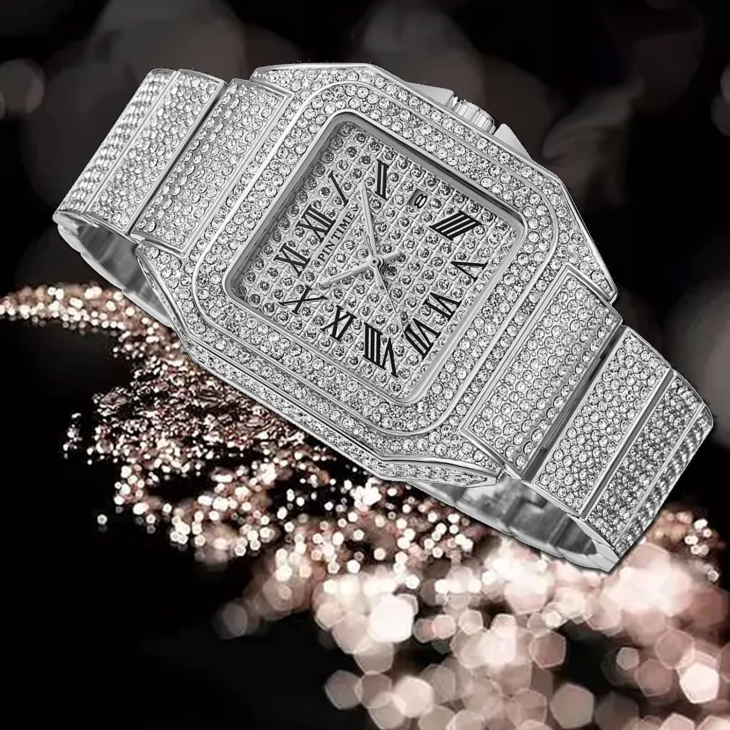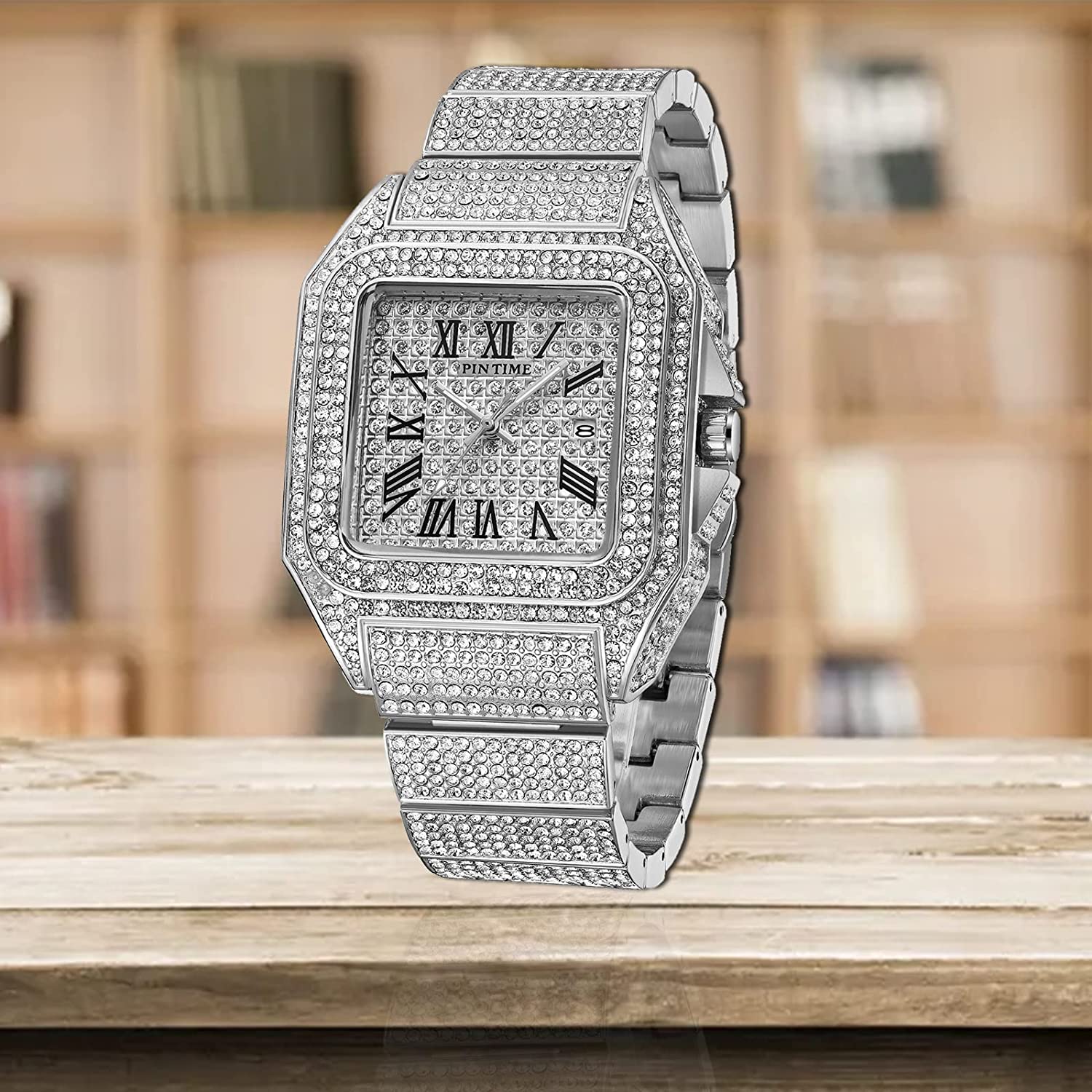 • Mens Design: Iced out luxury fashion watch for men. Big square full crystal 43mm face. Decorative screws in case and strap. Crown protective ear design. Wide Roman numeral markers and fluorescent sword hands. Date window at 3 o'clock.