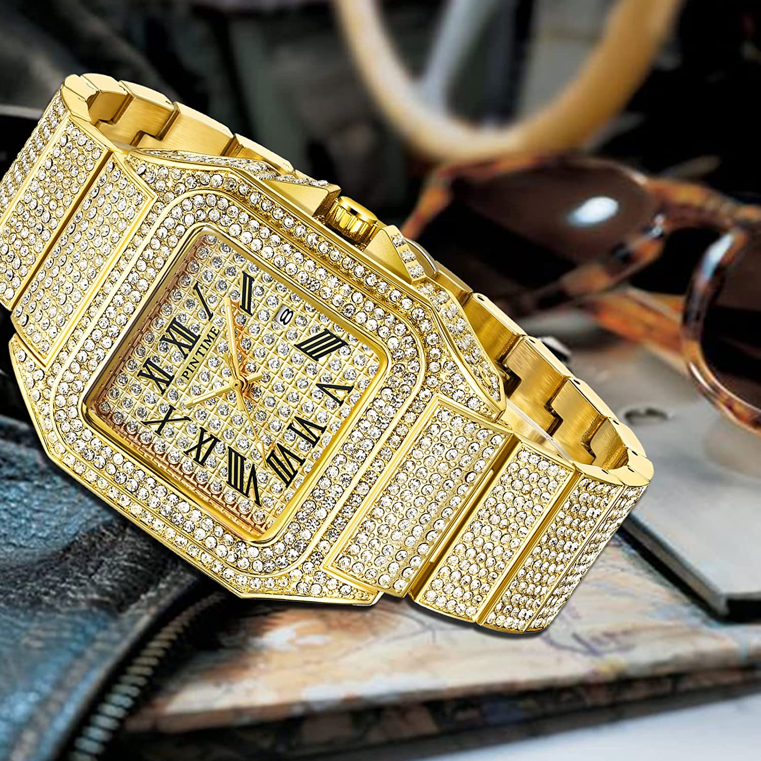 PINTIME Mens Full Iced Out 43mm Big Face Bling Luxury Crystal Square Watches Fashion Hip Hop Jewelry Watch for Men