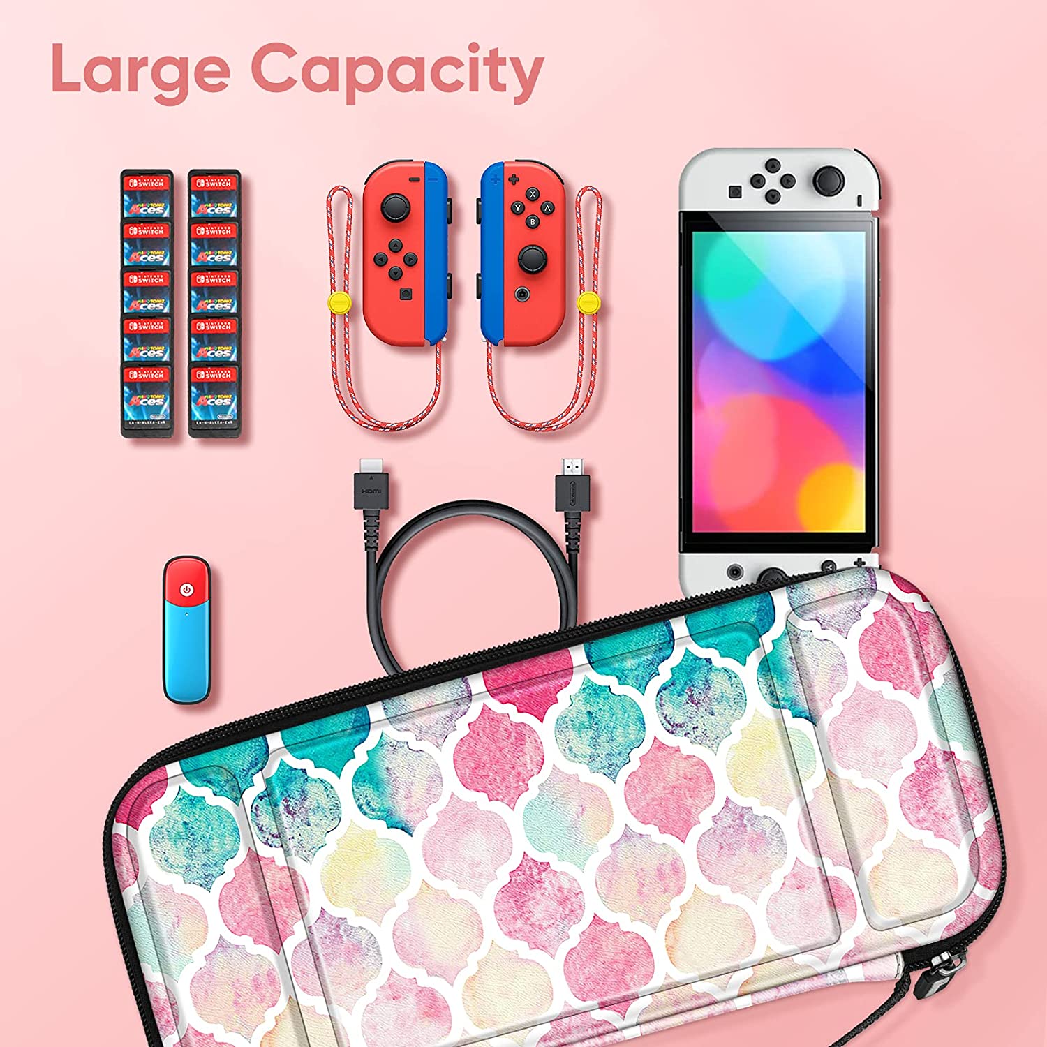 - Designed to make your Nintendo Switch / Switch OLED Model console and accessories more portable & travel-friendly. This carrying case fits Switch Console with both Joy-Con attached on.
