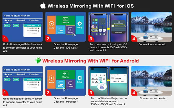 • ❤【WIRELESS WiFi CONNECTION】 Latest WiFi connecting function is compatible with IOS and Android system. You do not need converting cable such troublesome thing, just once-time WiFi connection and you can connect your device with the Portable home bluetooth projector whenever you want to use it.(Attention: Make sure both your phone and the 1080p wifi bluetooth projector are connect to the same wifi network )